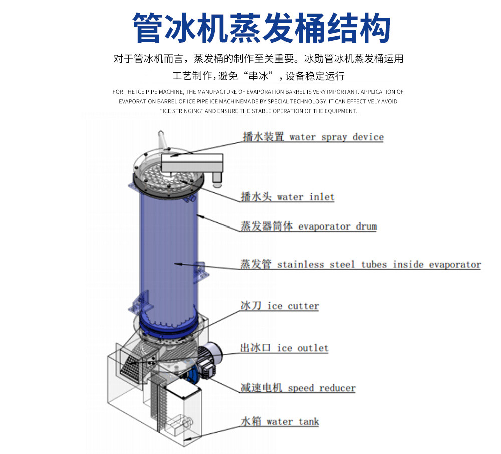 2、管冰機(jī)所有與制冰水接觸部分材質(zhì)均是食用級材料。 由多根不銹鋼管組成蒸發(fā)器制冷劑在管與管之間流動,水在管內(nèi)從上往下在分水器的作用下呈螺旋狀流動, 水在流動過程中形成冰。